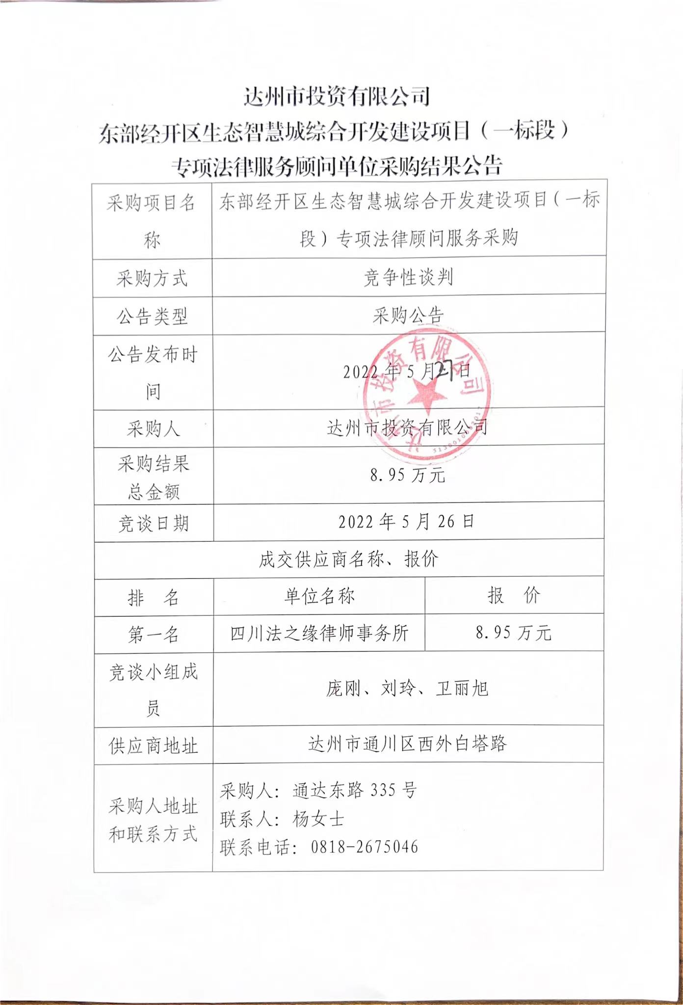 東部經(jīng)開(kāi)區(qū)生態(tài)智慧城綜合開(kāi)發(fā)建設(shè)項(xiàng)目(一標(biāo)段)專(zhuān)項(xiàng)法律服務(wù)顧問(wèn)單位采購(gòu)結(jié)果公告