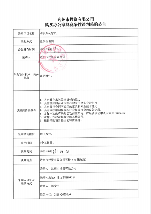 達(dá)州市投資有限公司購(gòu)買辦公家具競(jìng)爭(zhēng)性談判采購(gòu)公告